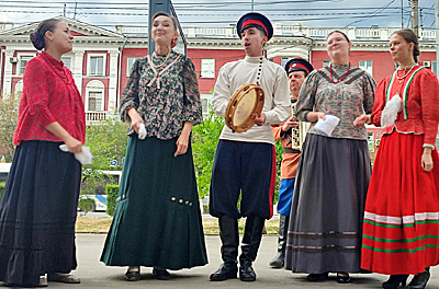 В торжественном открытии БиблиоНочи принял участие фольклорный ансамбль «Венец» ГО БУК ВО «ВГИИК», кафедра народного вокального искусства и дирижирования (руководитель О. С. Васильева, концертмейстер А. Н. Витошнов). Несмотря на хмурость небес, на уличной площадке, при большом стечении народа, «Венец» играл казачьи песни, исполненные в лучших вокально-певческих традициях донских казаков.